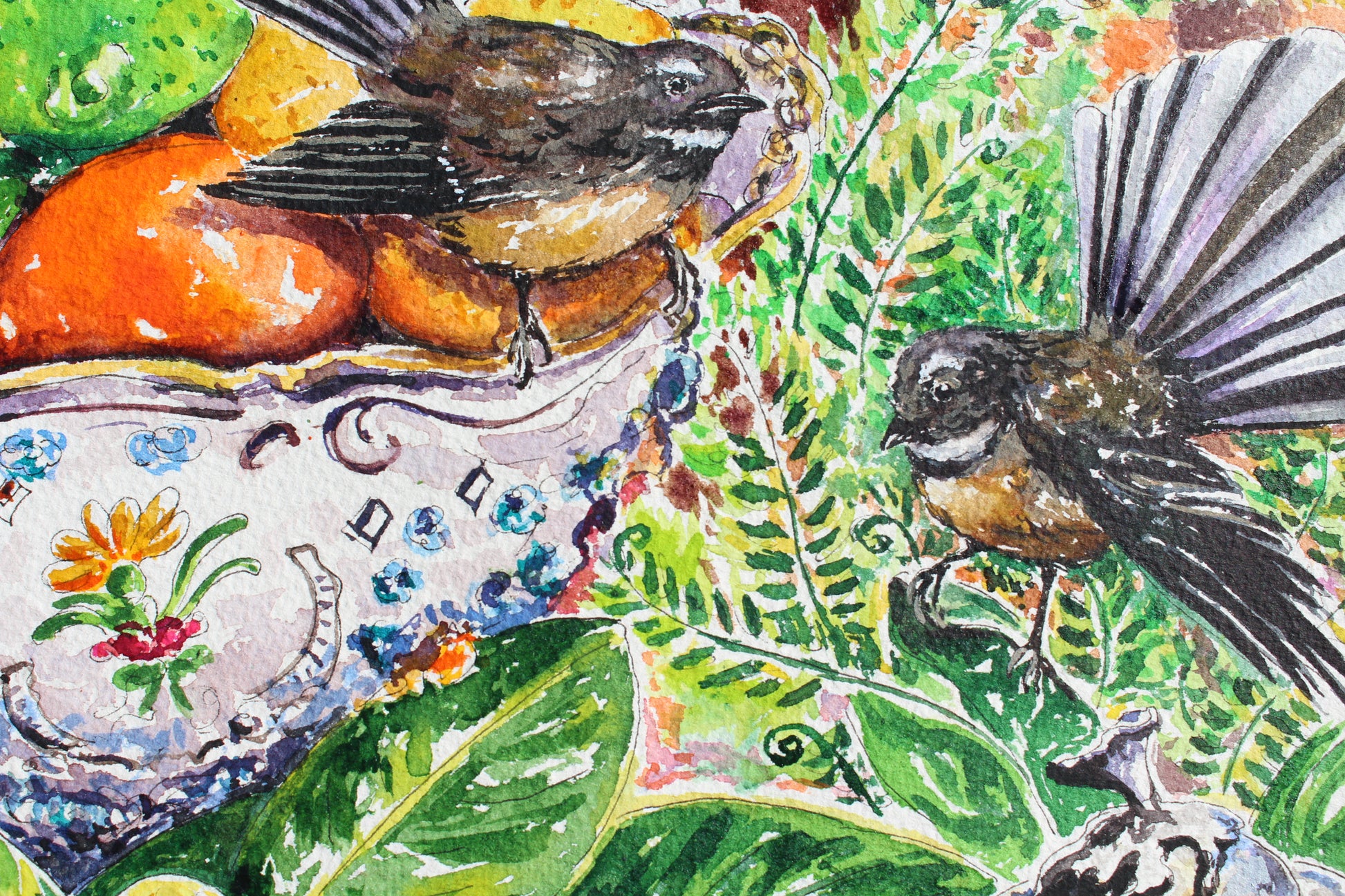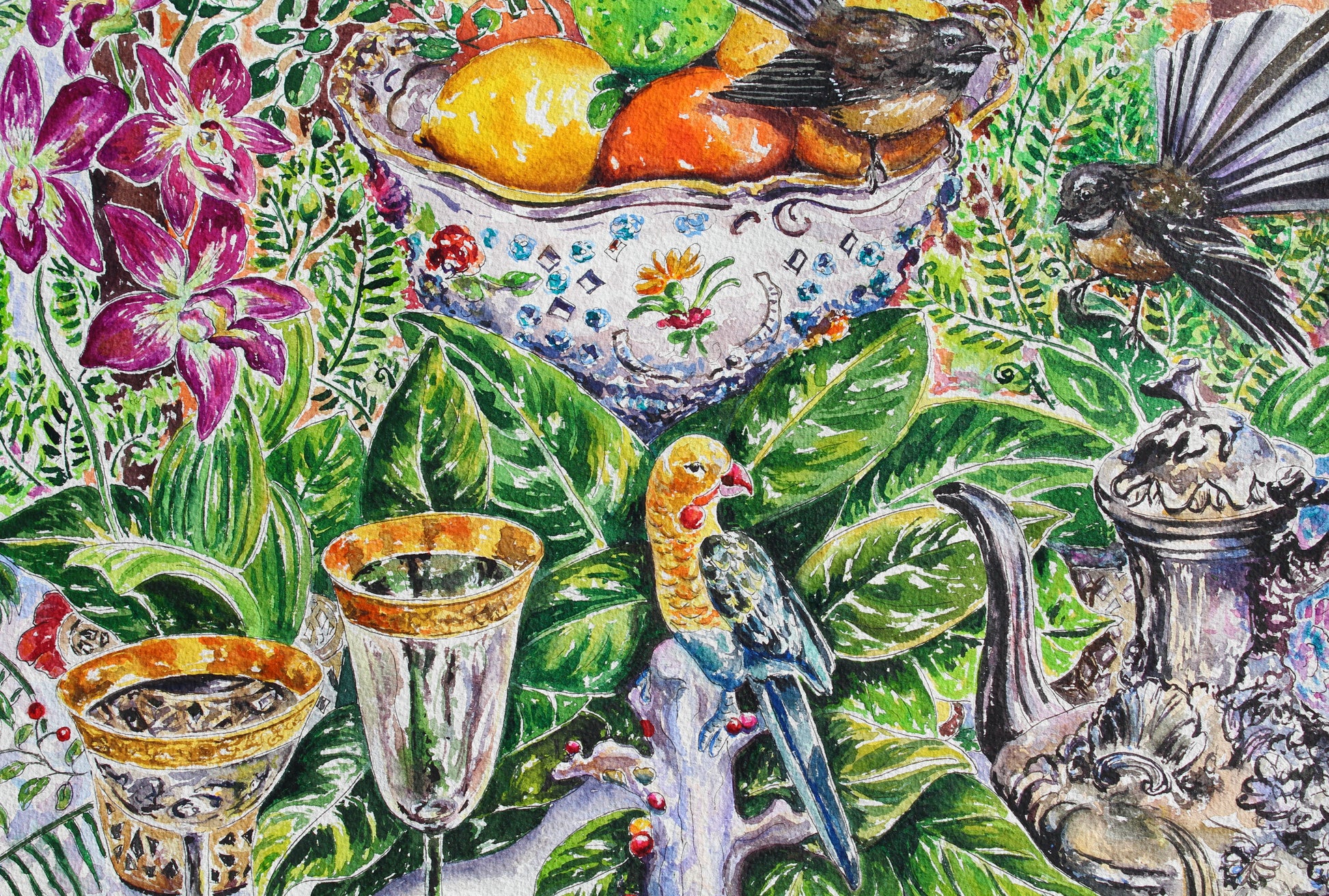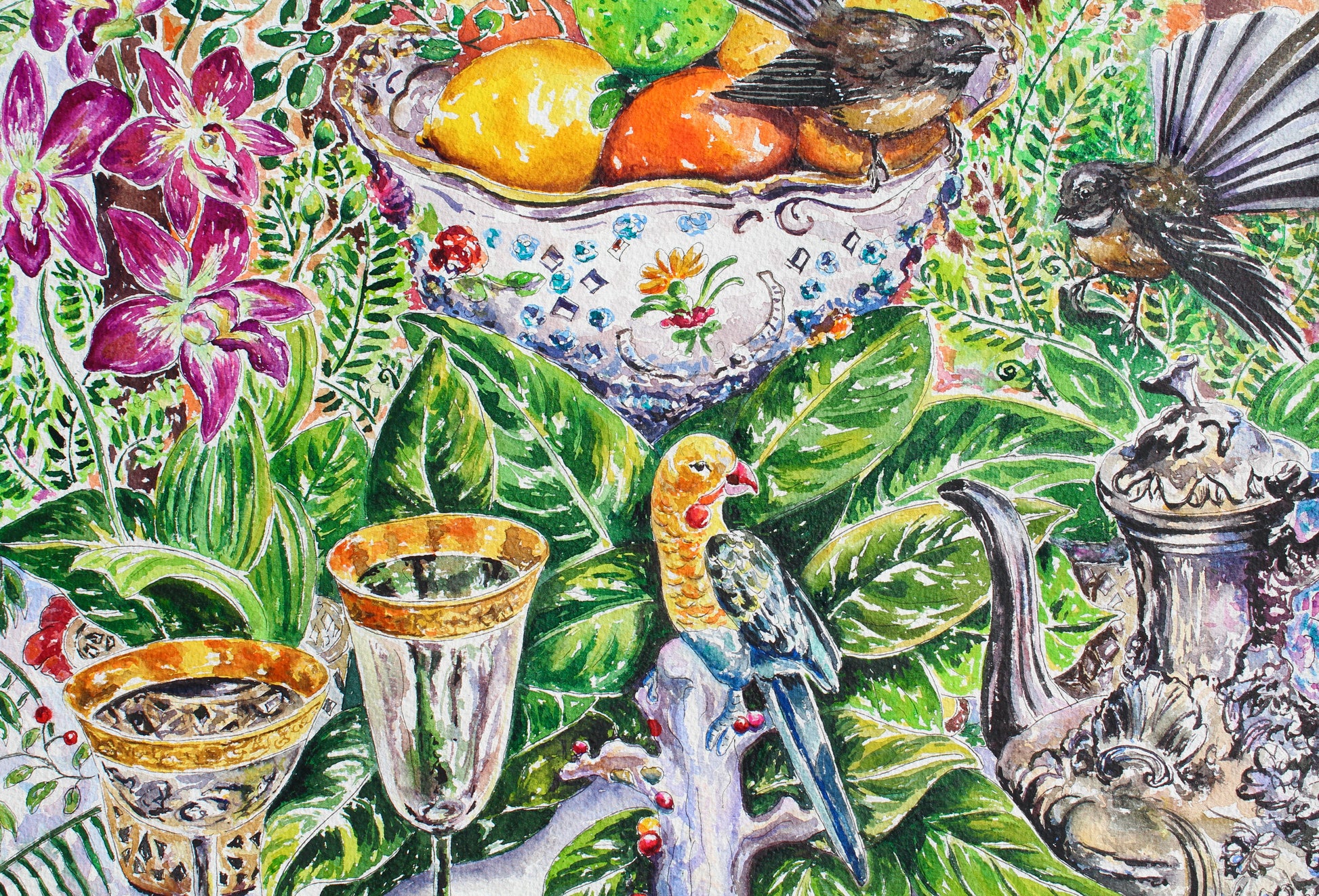 It was a lot of fun to paint this, I love these quirky table scenes! This painting was inspired by my love of interesting table settings, birds and a fabulous interior designer, Mary F. Saunders. A pair of New Zealand Fantail birds called Piwakawaka have invited themselves into this elegant table scene!