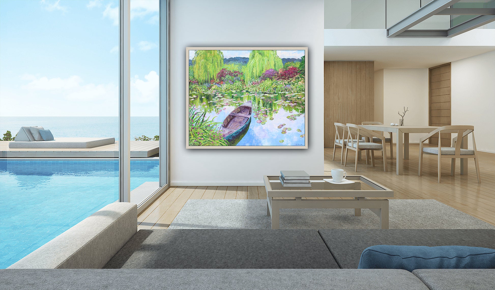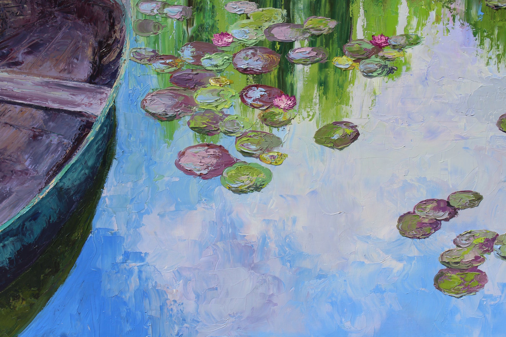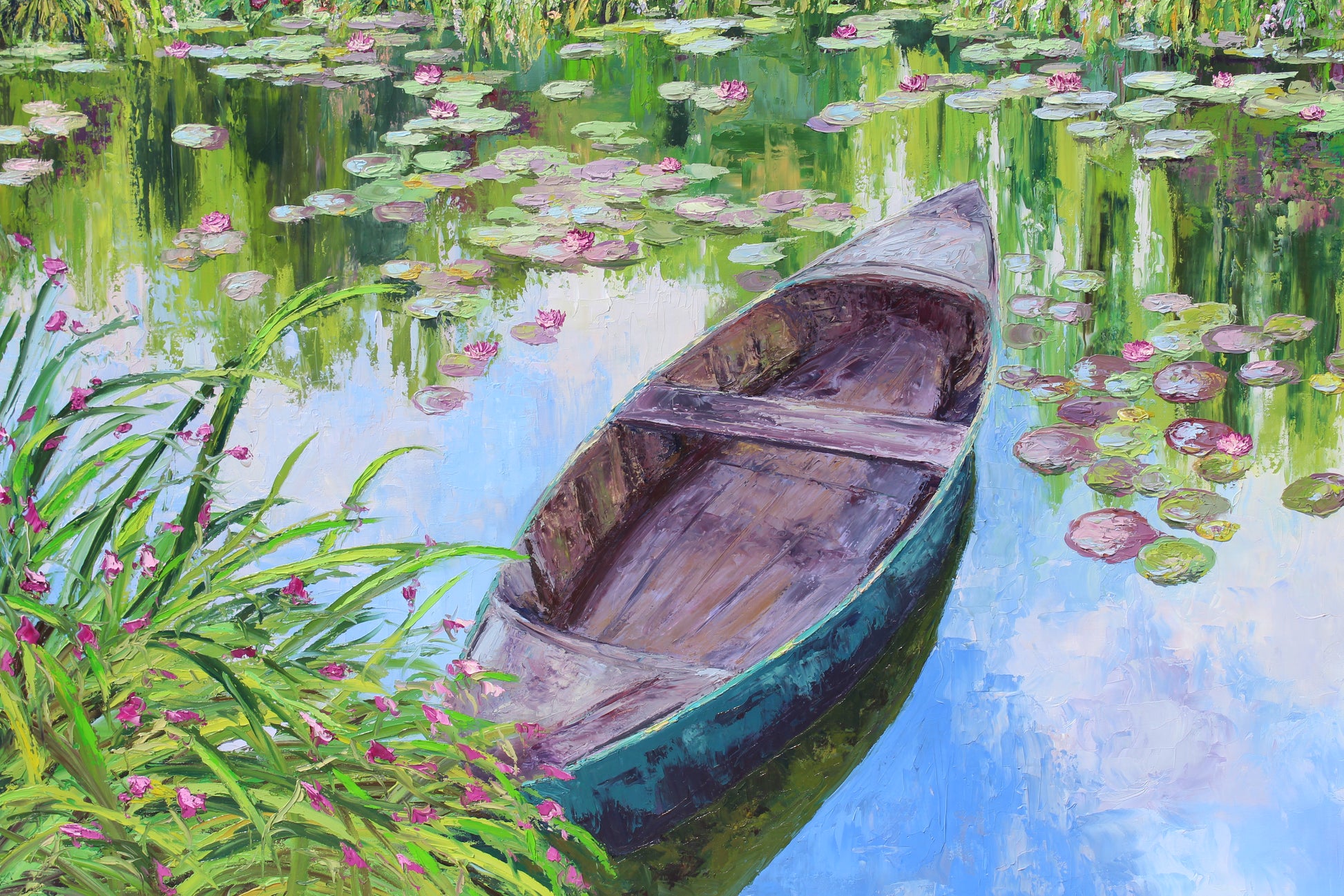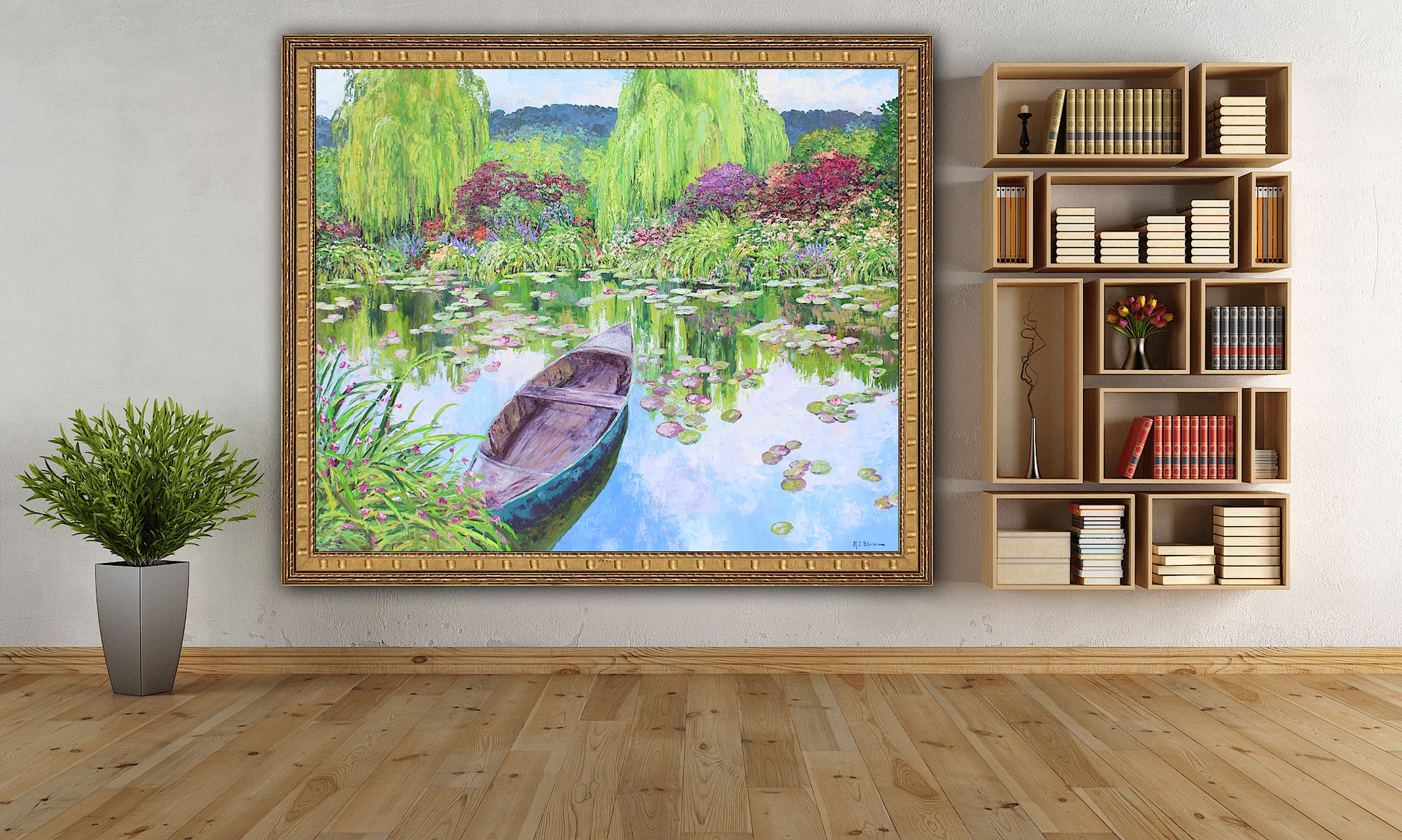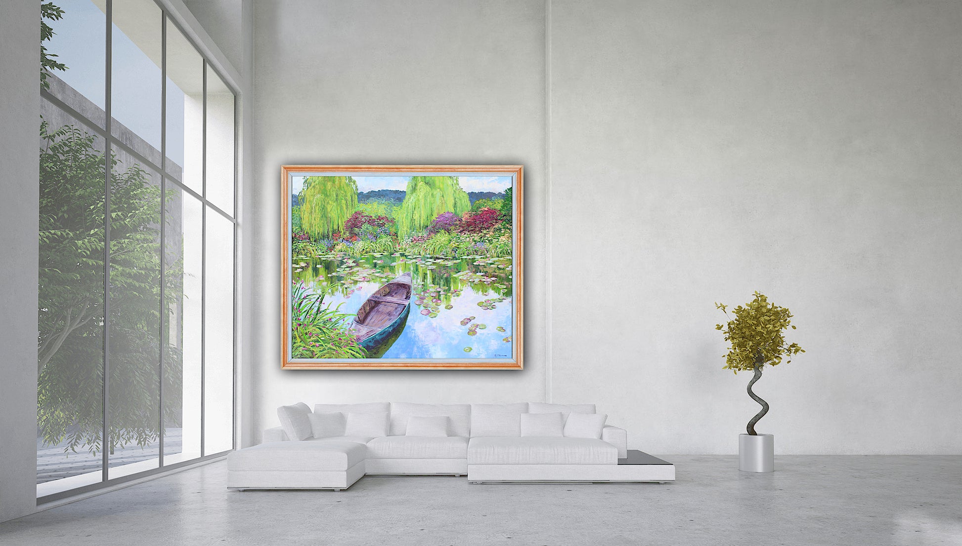 An extra large 50" x 60" or 127cm x 152.4cm, original oil painting of Monet's pond at Giverny with the Norwegian boat in the front. Water lilies drift gently across the surface of the tranquil pond with clouds, blue sky and tree reflections. This is an amazing painting that would look fabulous in almost any style of frame. It's impressionist but also contemporary in style.