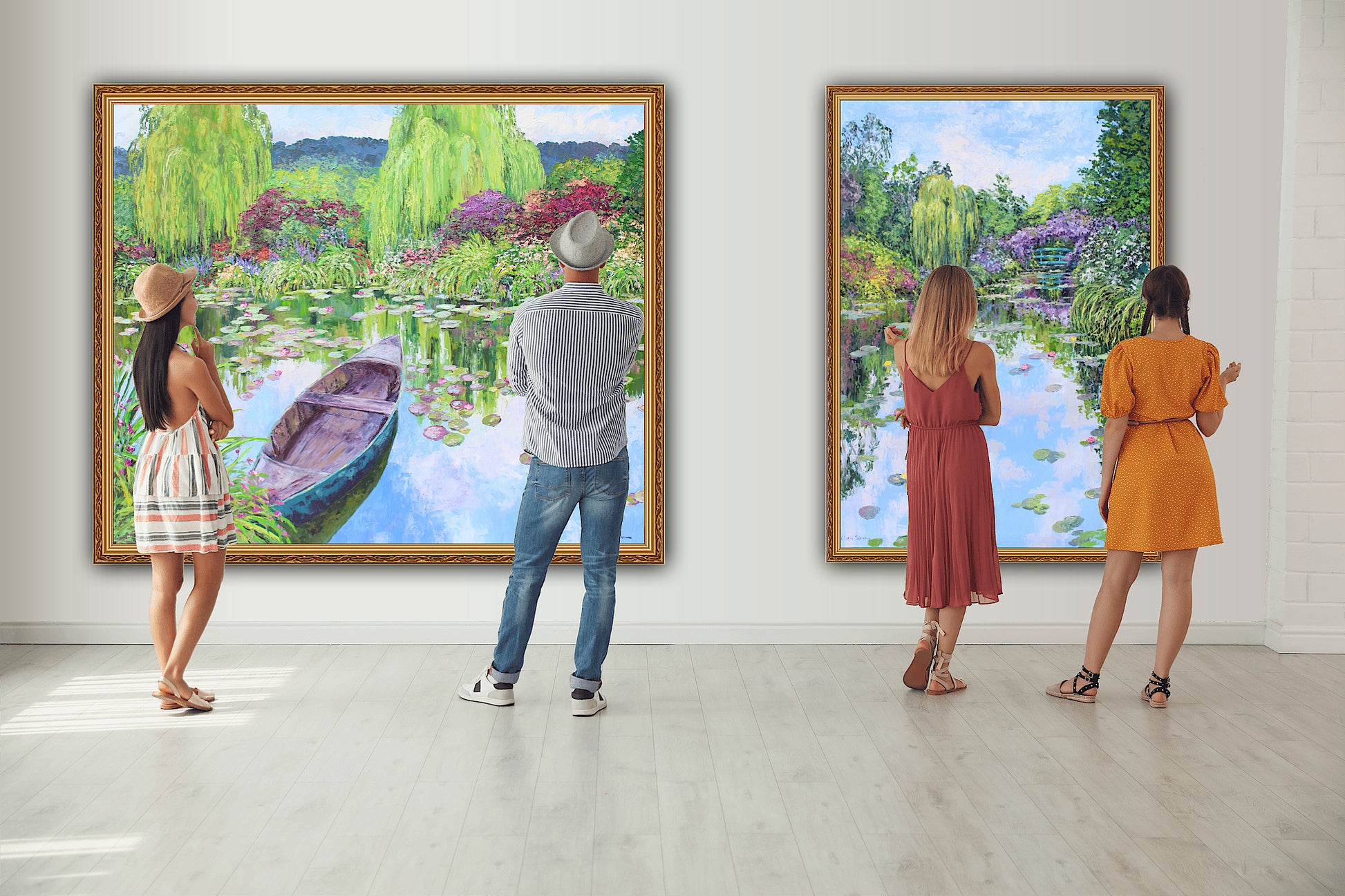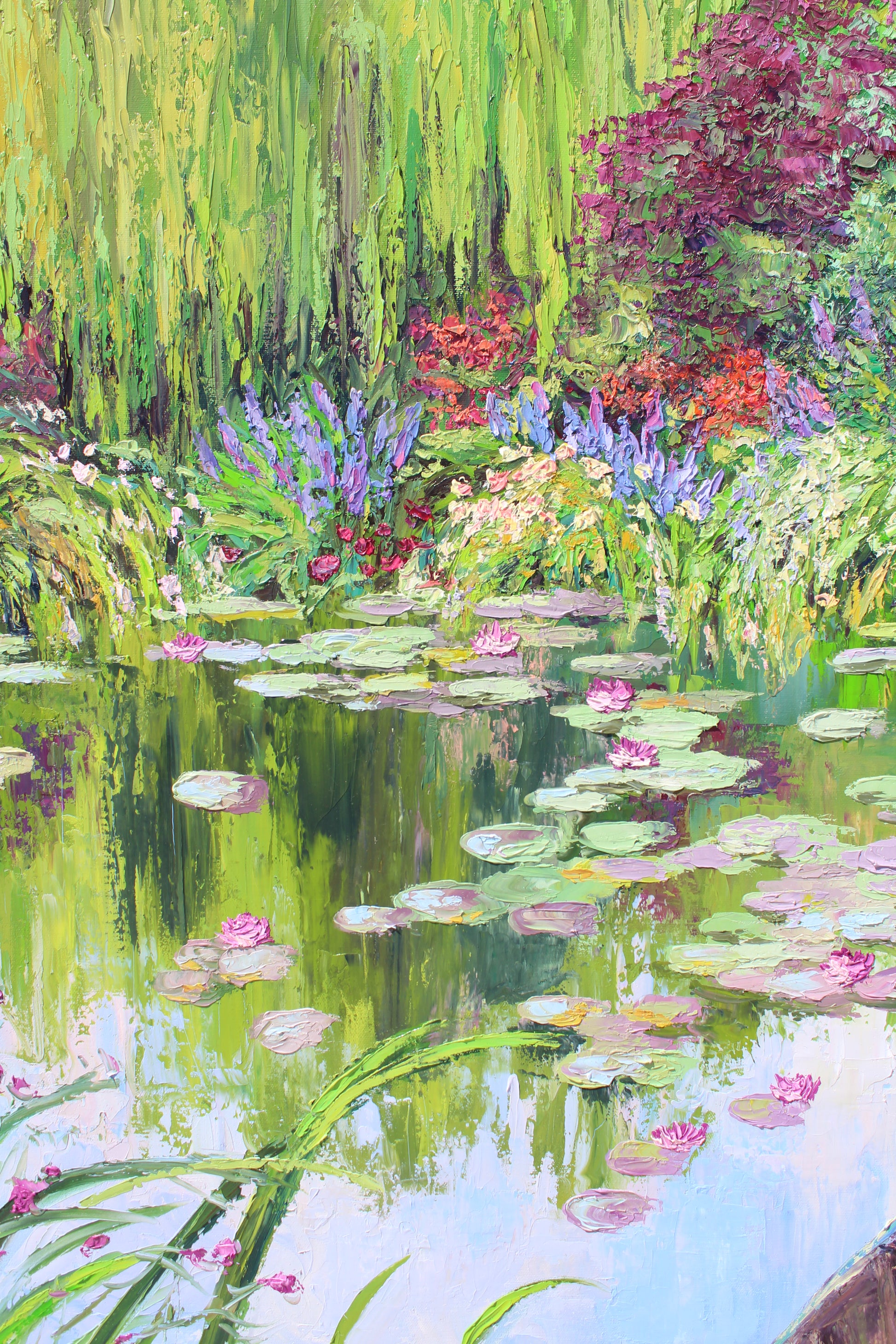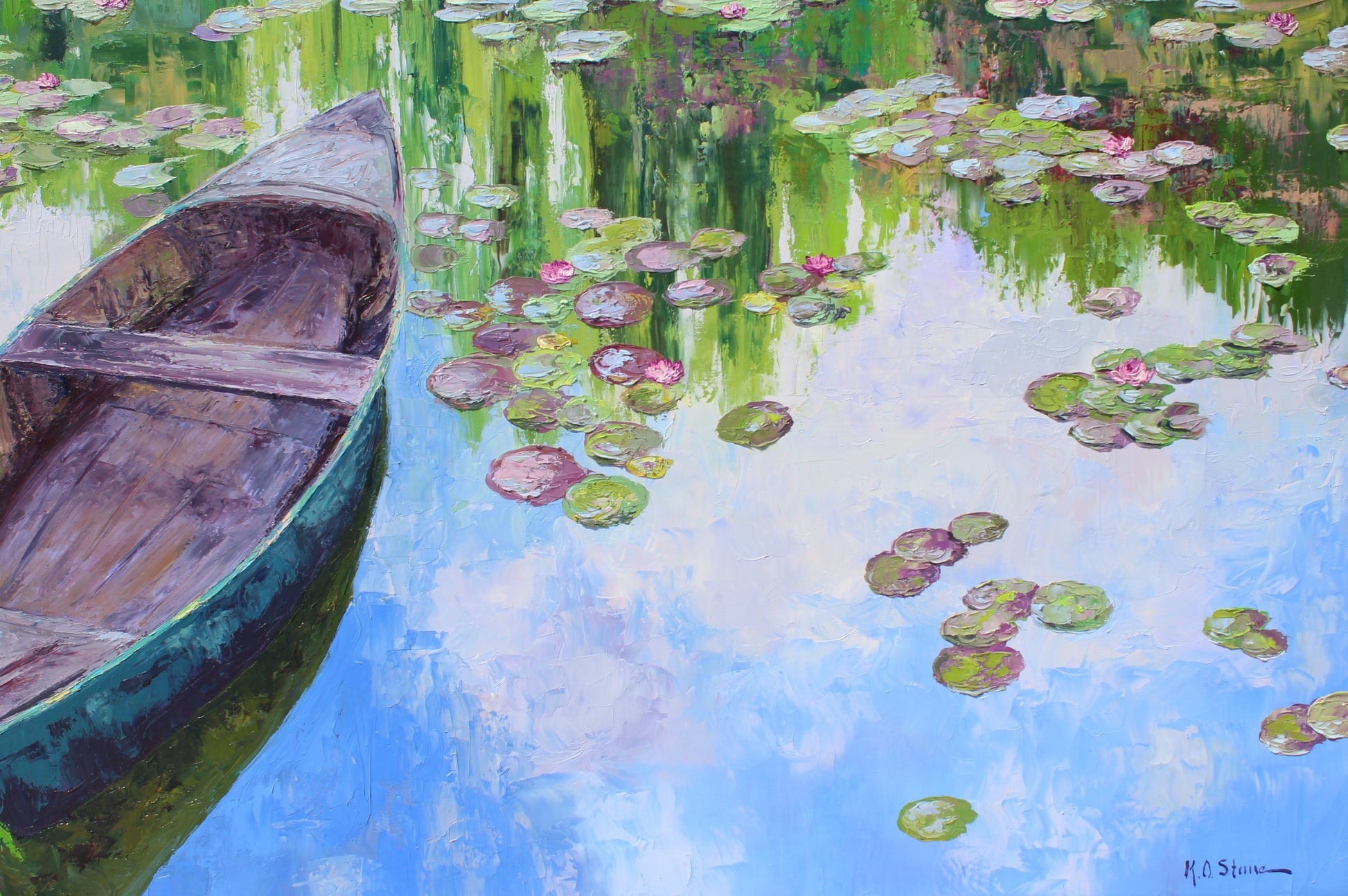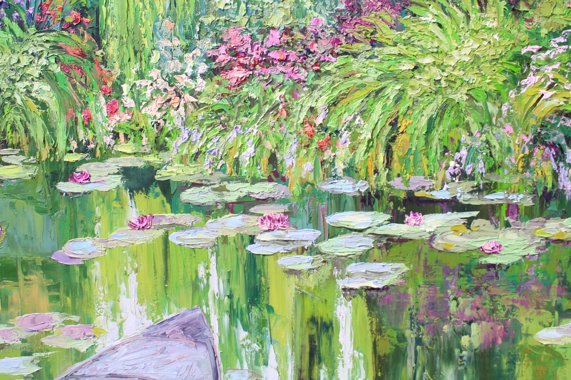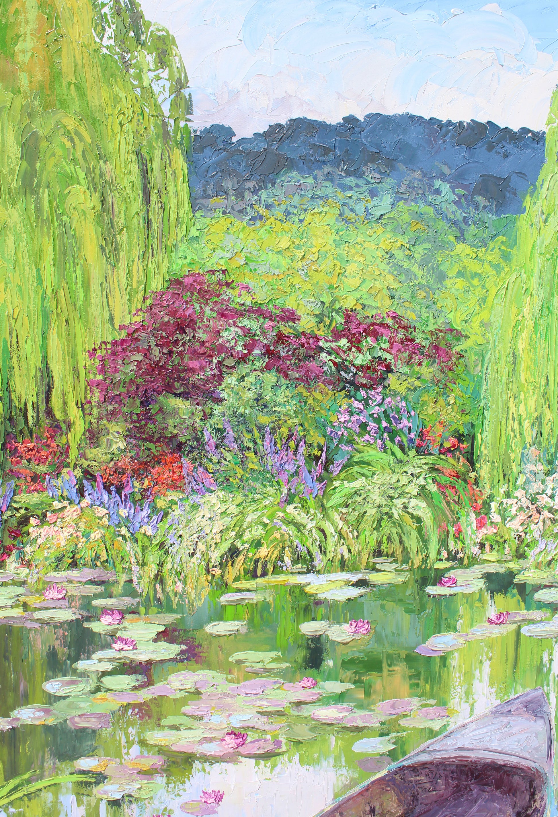 An extra large 50" x 60" or 127cm x 152.4cm, original oil painting of Monet's pond at Giverny with the Norwegian boat in the front. Water lilies drift gently across the surface of the tranquil pond with clouds, blue sky and tree reflections. This is an amazing painting that would look fabulous in almost any style of frame. It's impressionist but also contemporary in style.