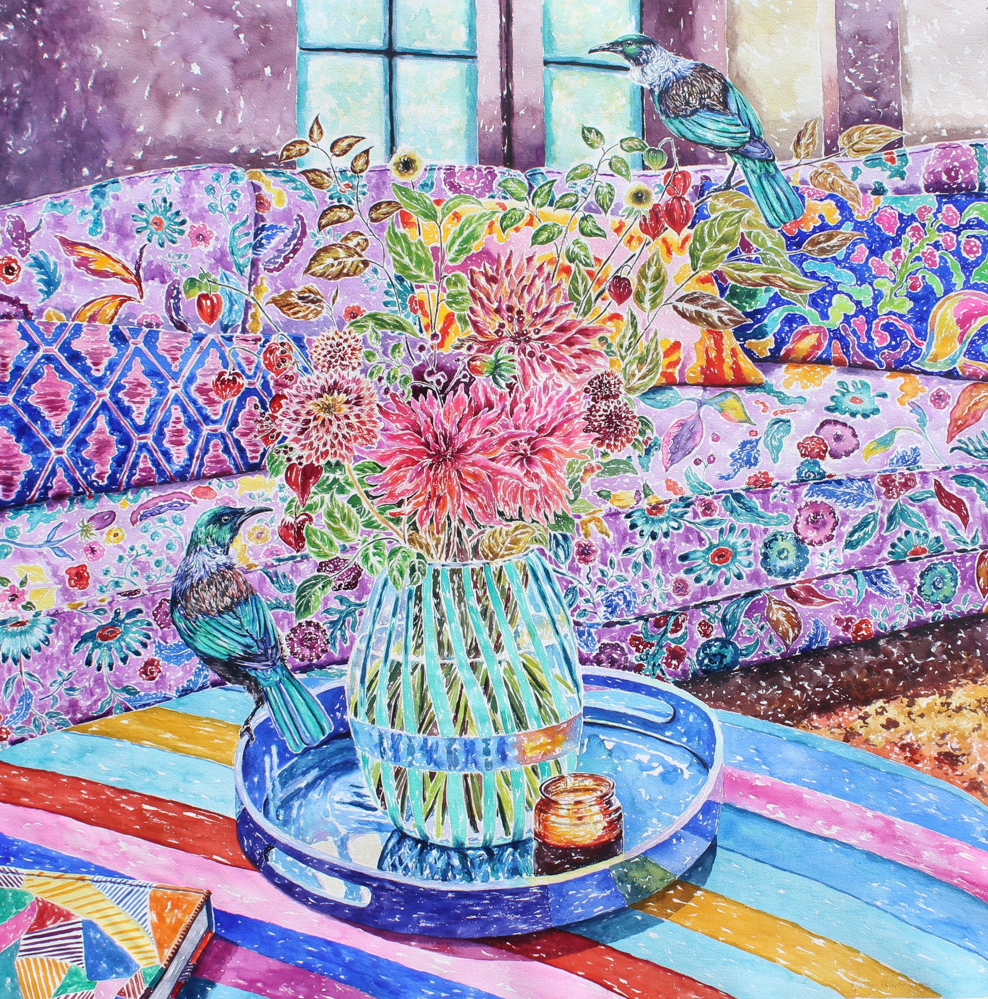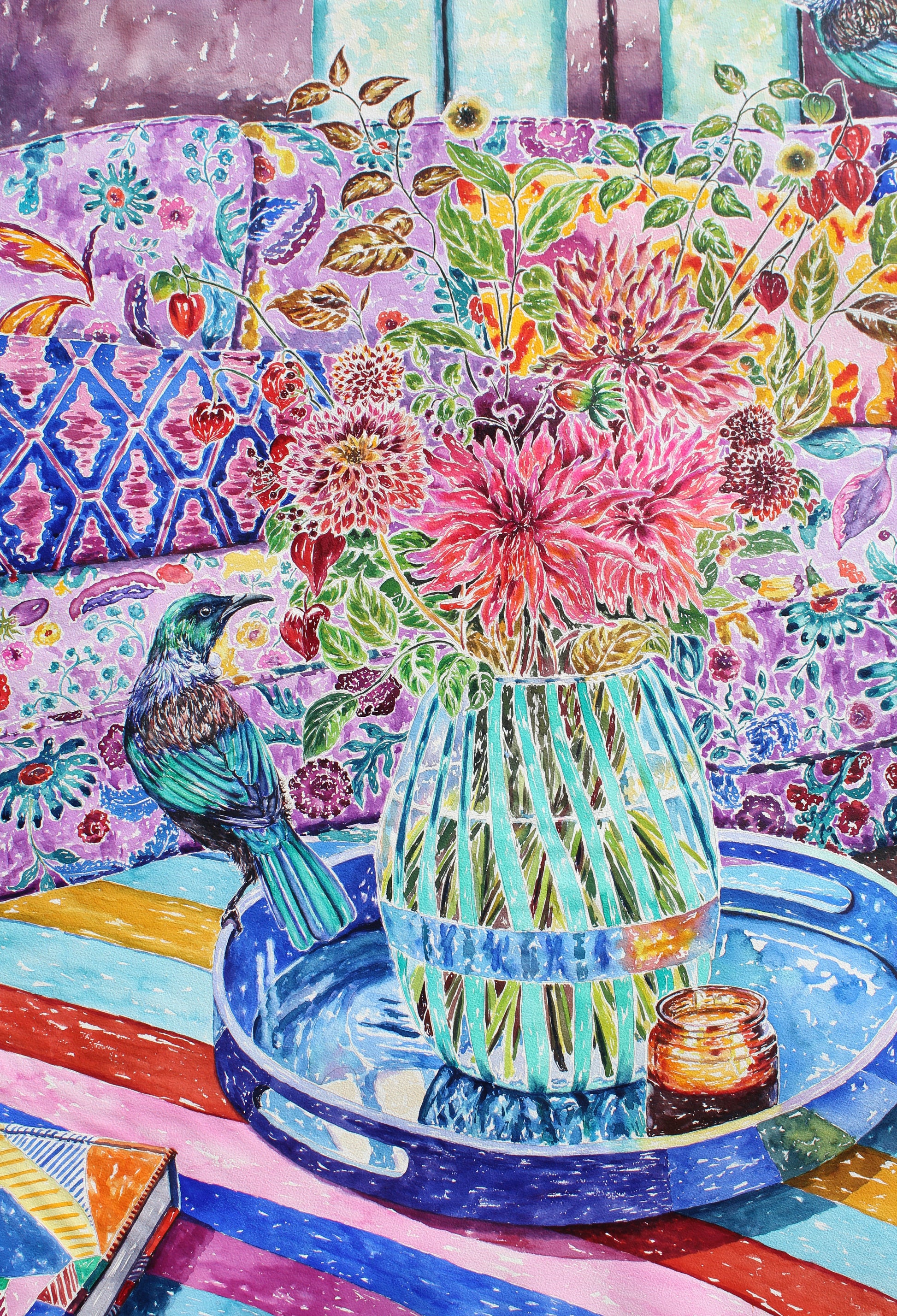 An open edition Giclee print of my painting of my watercolor and ink painting of two Tui birds perched on a gorgeous glass vase of flowers in a beautifully decorated room.