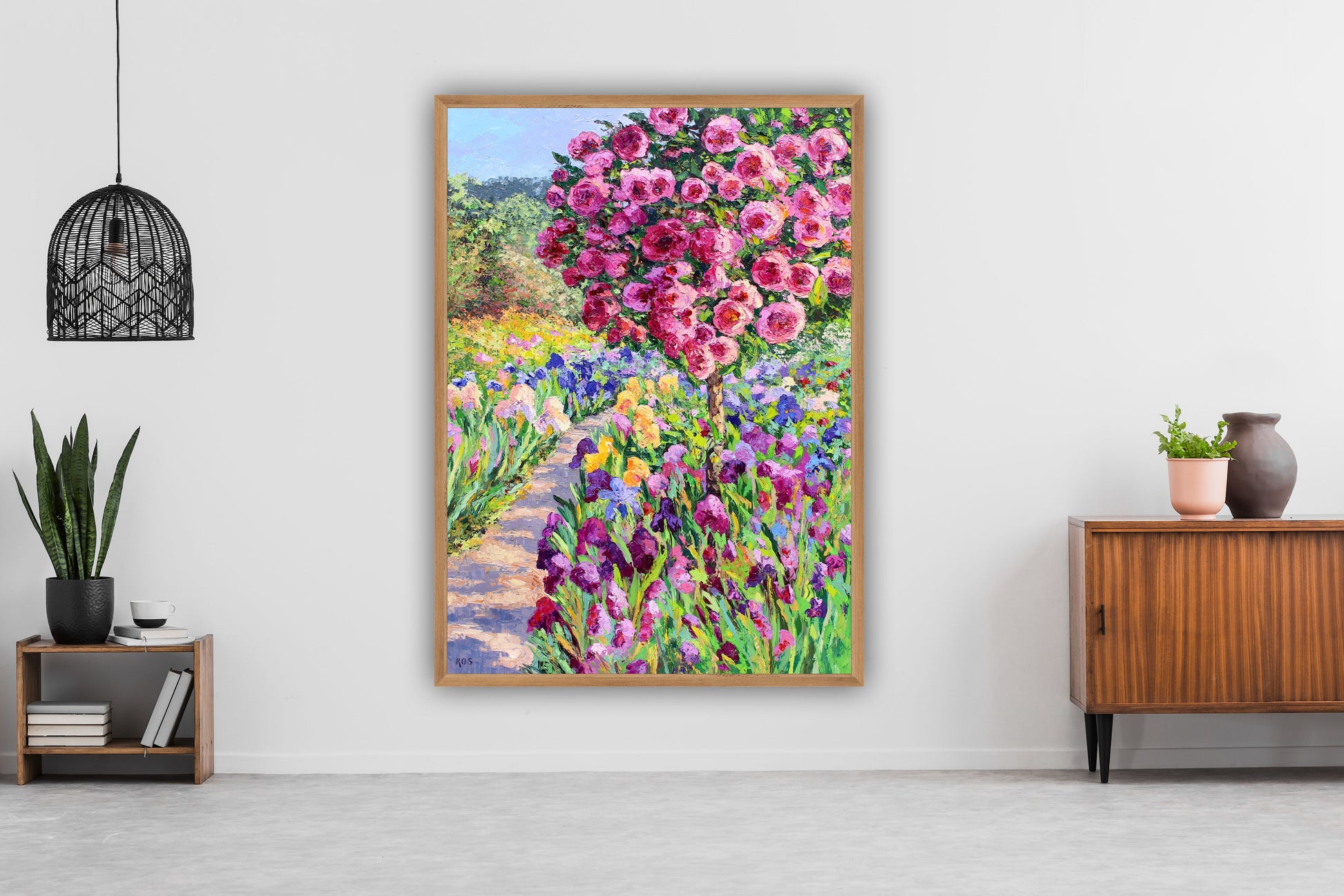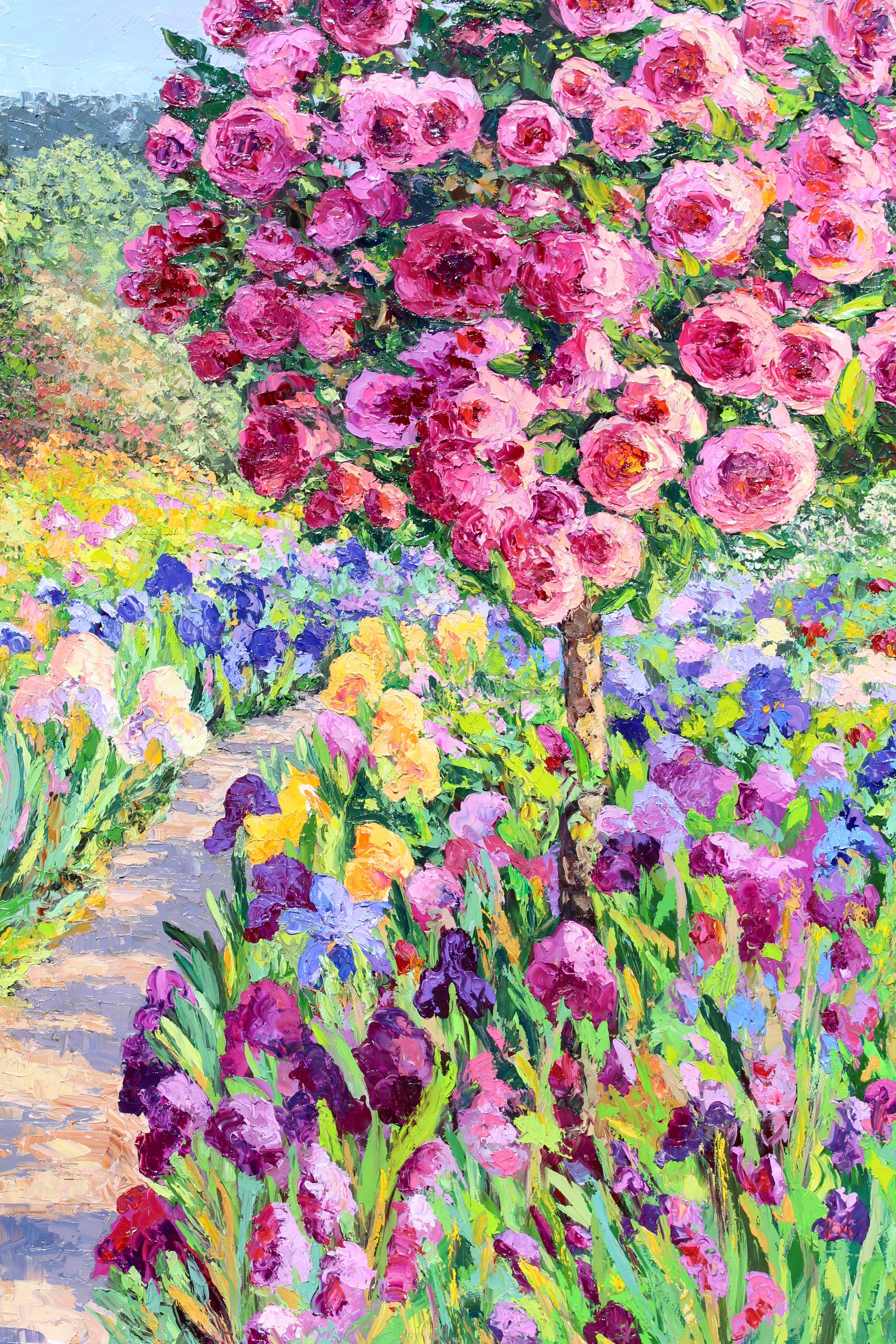 An original contemporary garden oil painting on stretched canvas of a towering rose tree along a sunlit path lined with Iris plants.