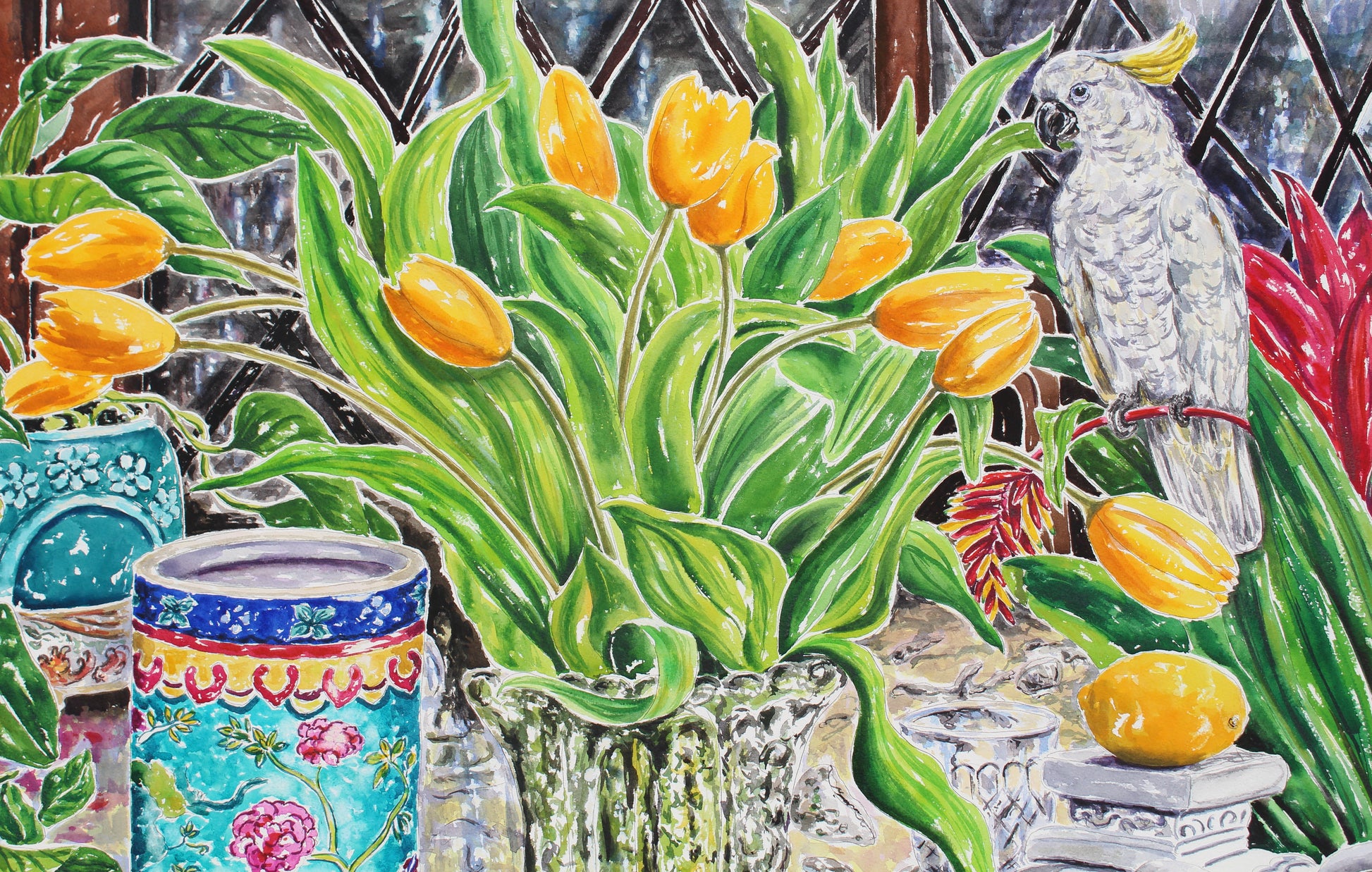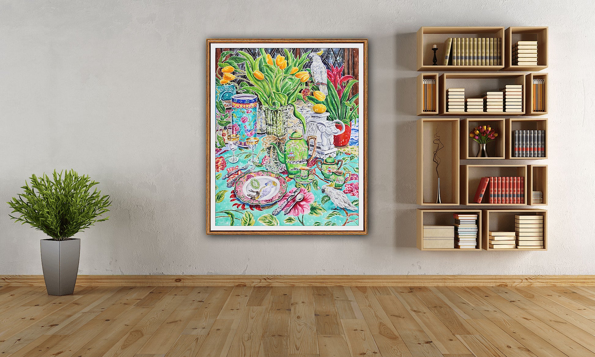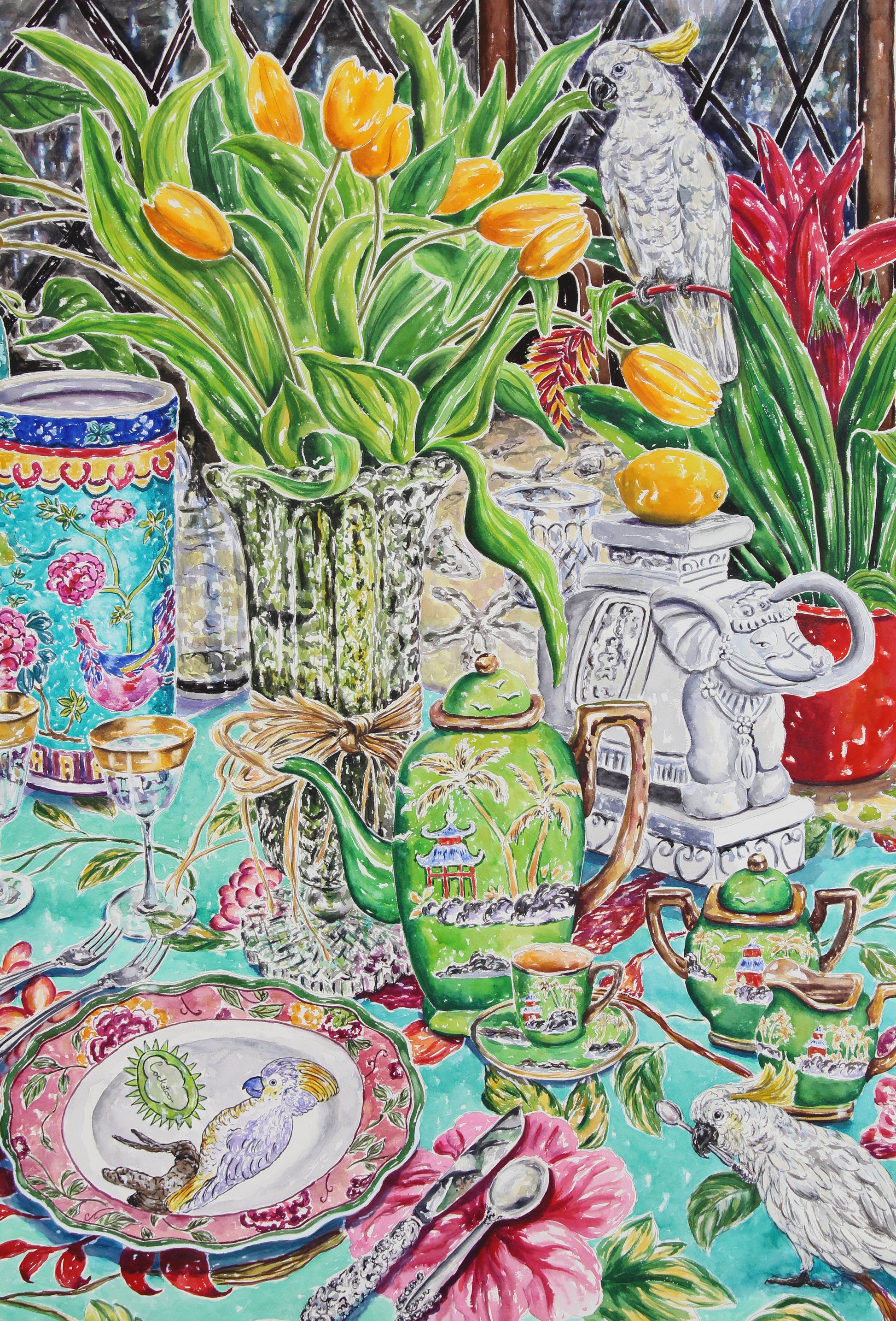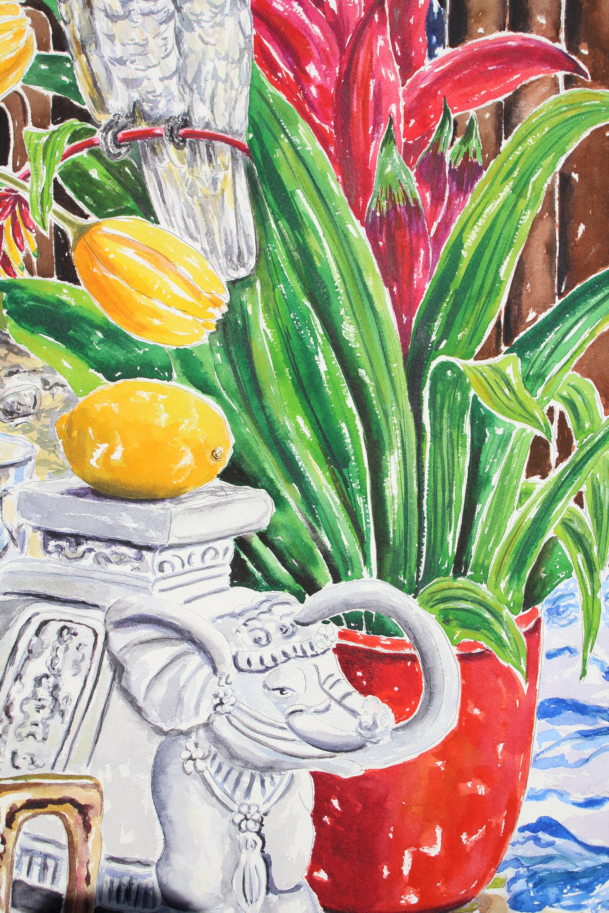 An original 50" x 40" or 127cm x 101.6cm, colorful, lively and very interesting watercolor and ink painting of 2 cockatoos in an eclectic table setting inspired by Mary F Saunders design. A vase of yellow tulips and a lemon is cleverly perched on top of the elephant sculpture. This painting is highly detailed yet still impressionist in style.