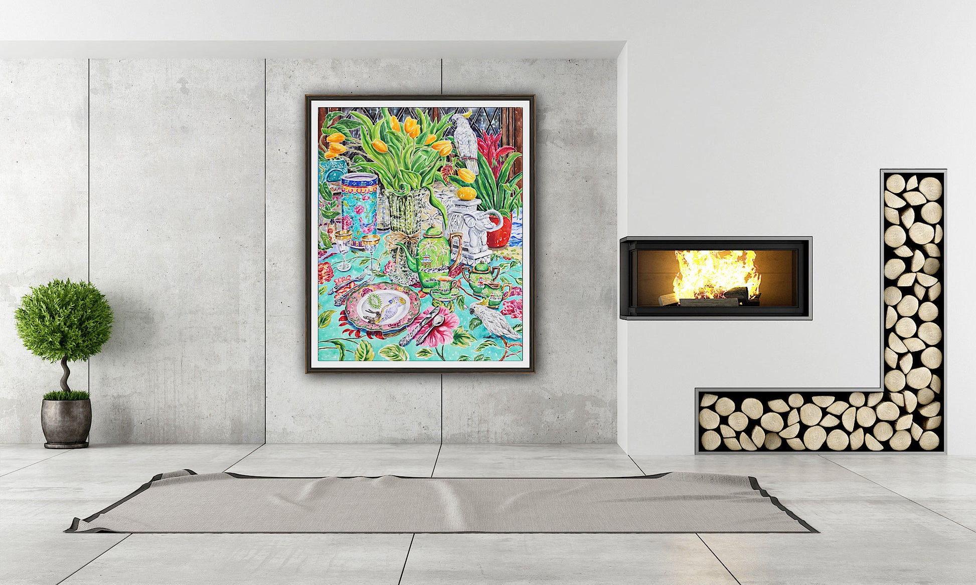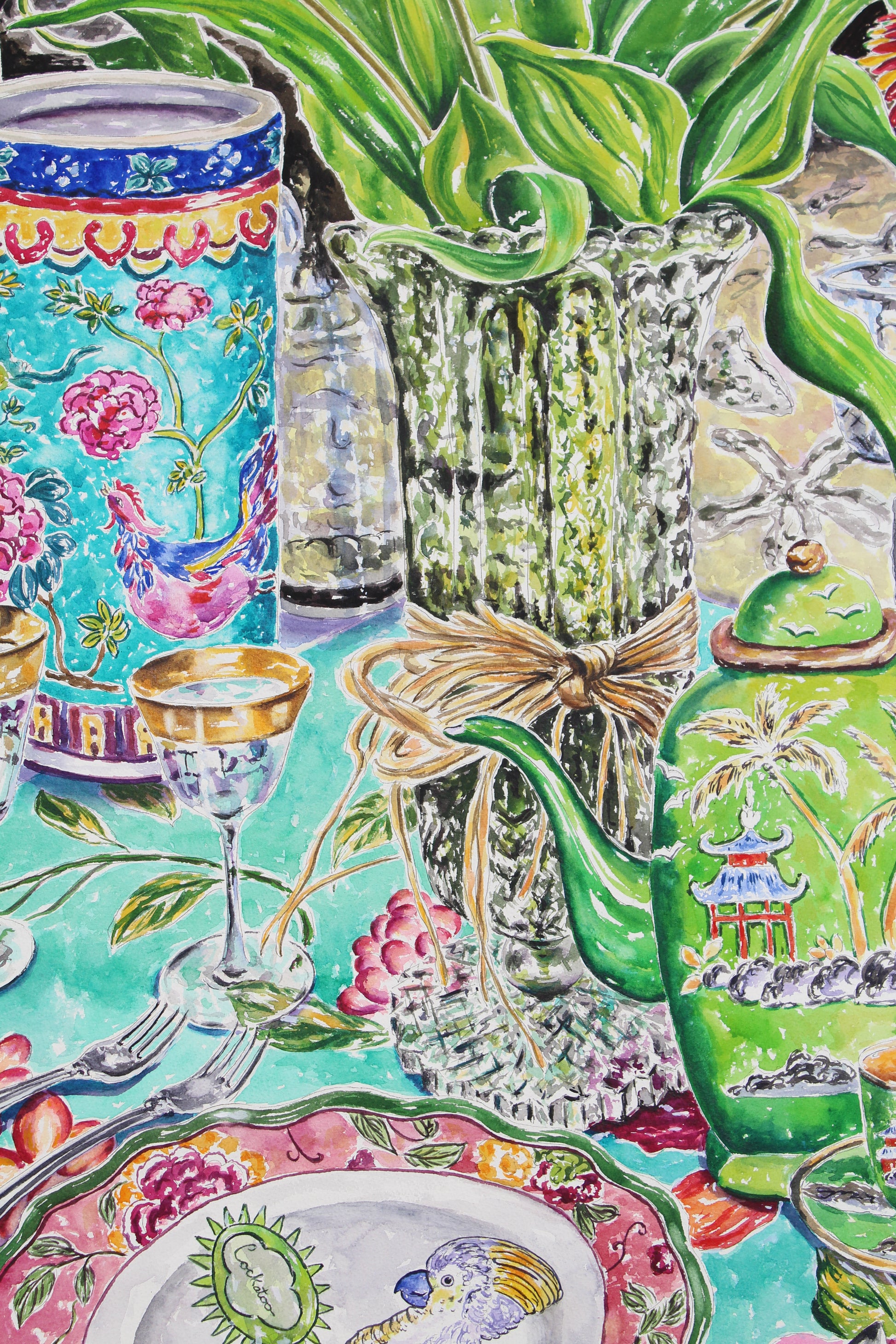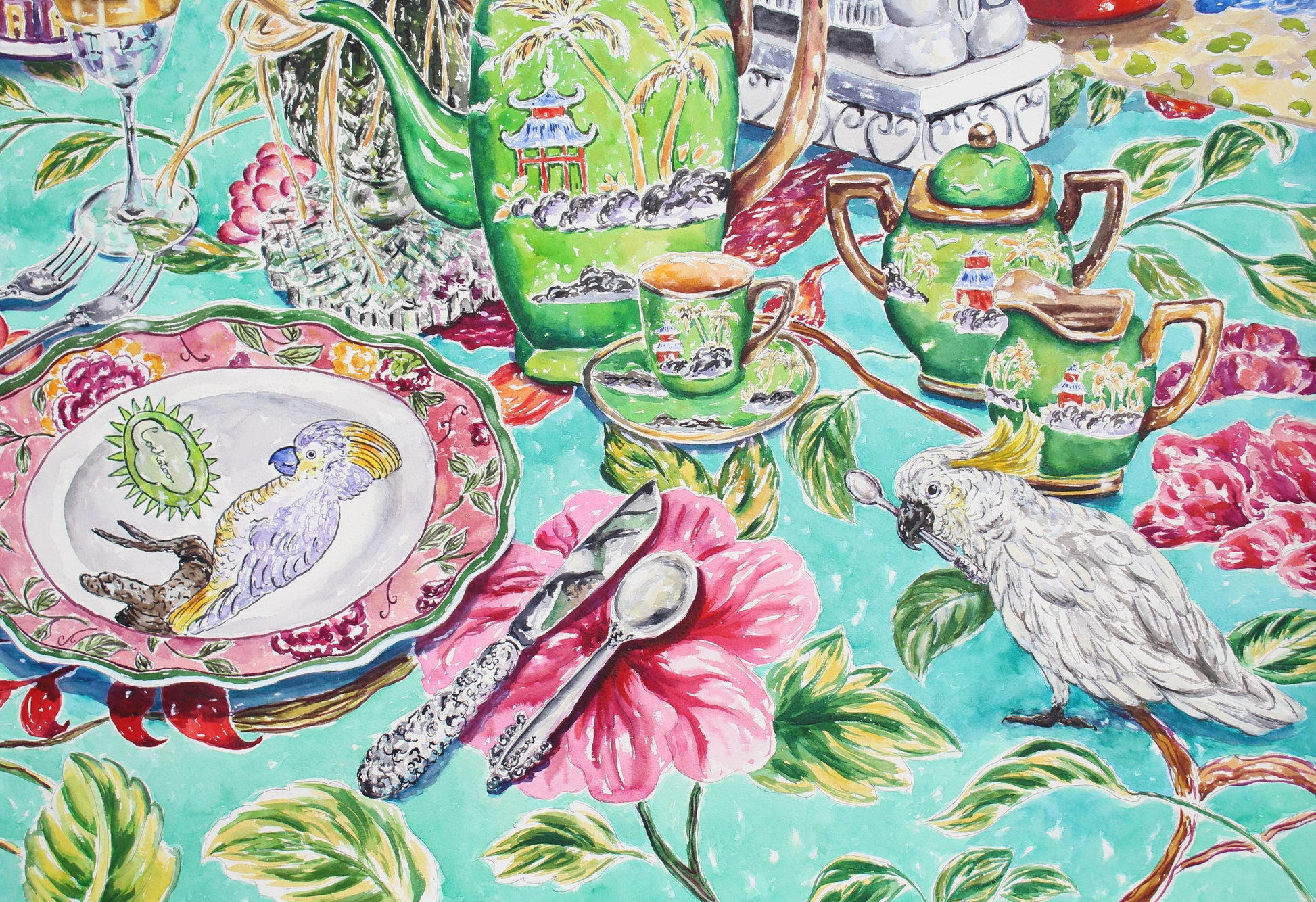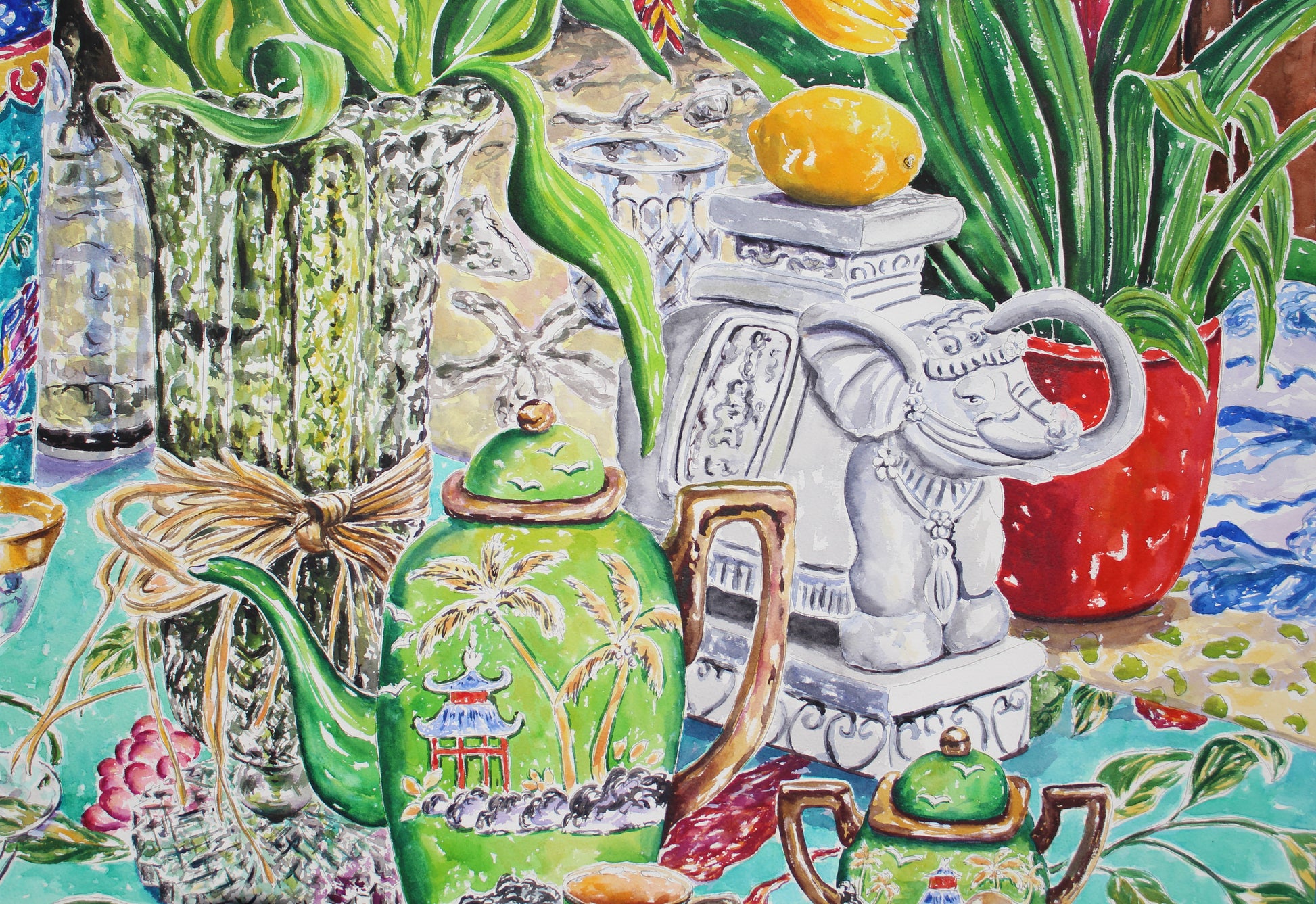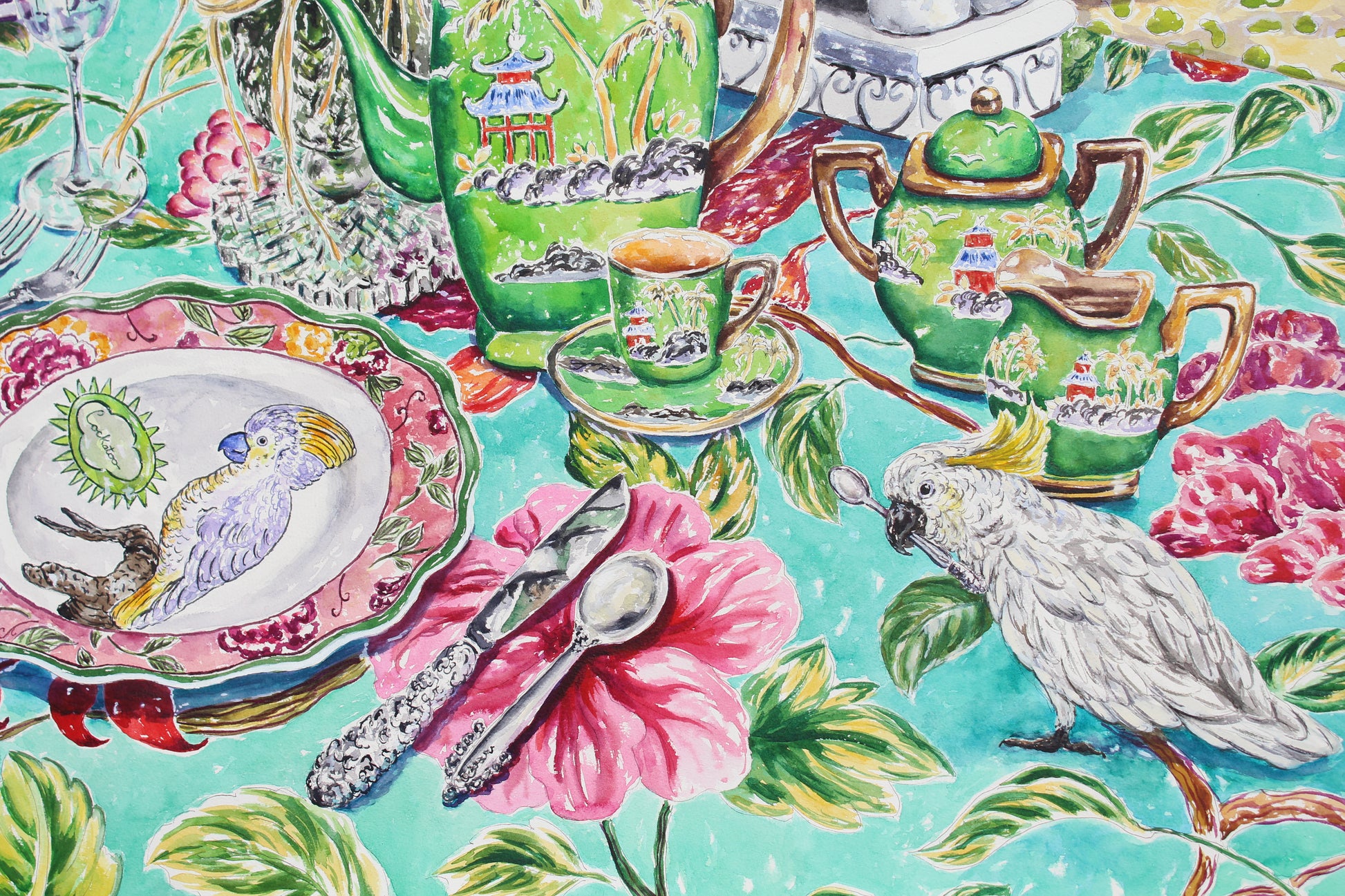 An original 50" x 40" or 127cm x 101.6cm, colorful, lively and very interesting watercolor and ink painting of 2 cockatoos in an eclectic table setting inspired by Mary F Saunders design. A vase of yellow tulips and a lemon is cleverly perched on top of the elephant sculpture. This painting is highly detailed yet still impressionist in style.