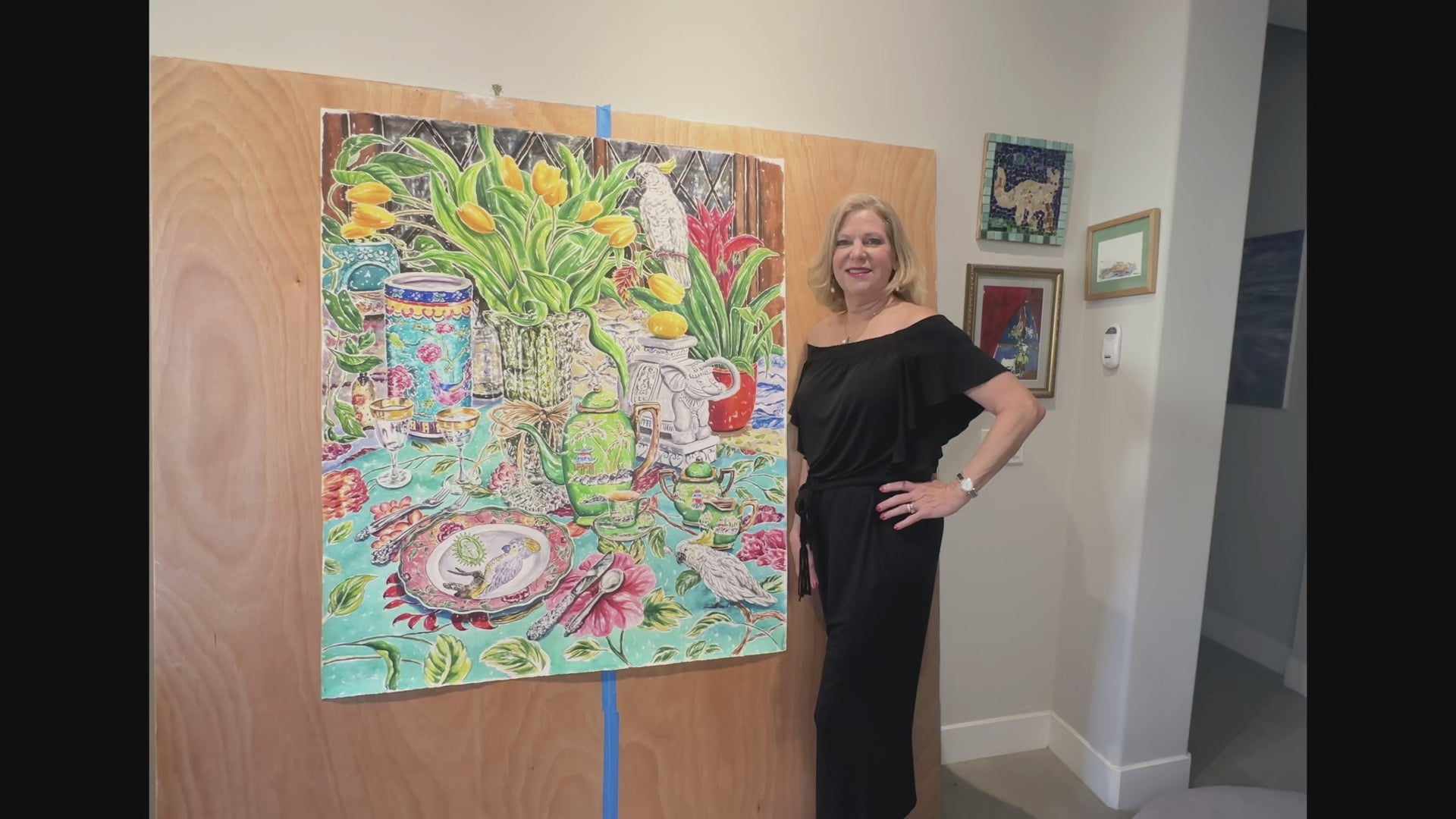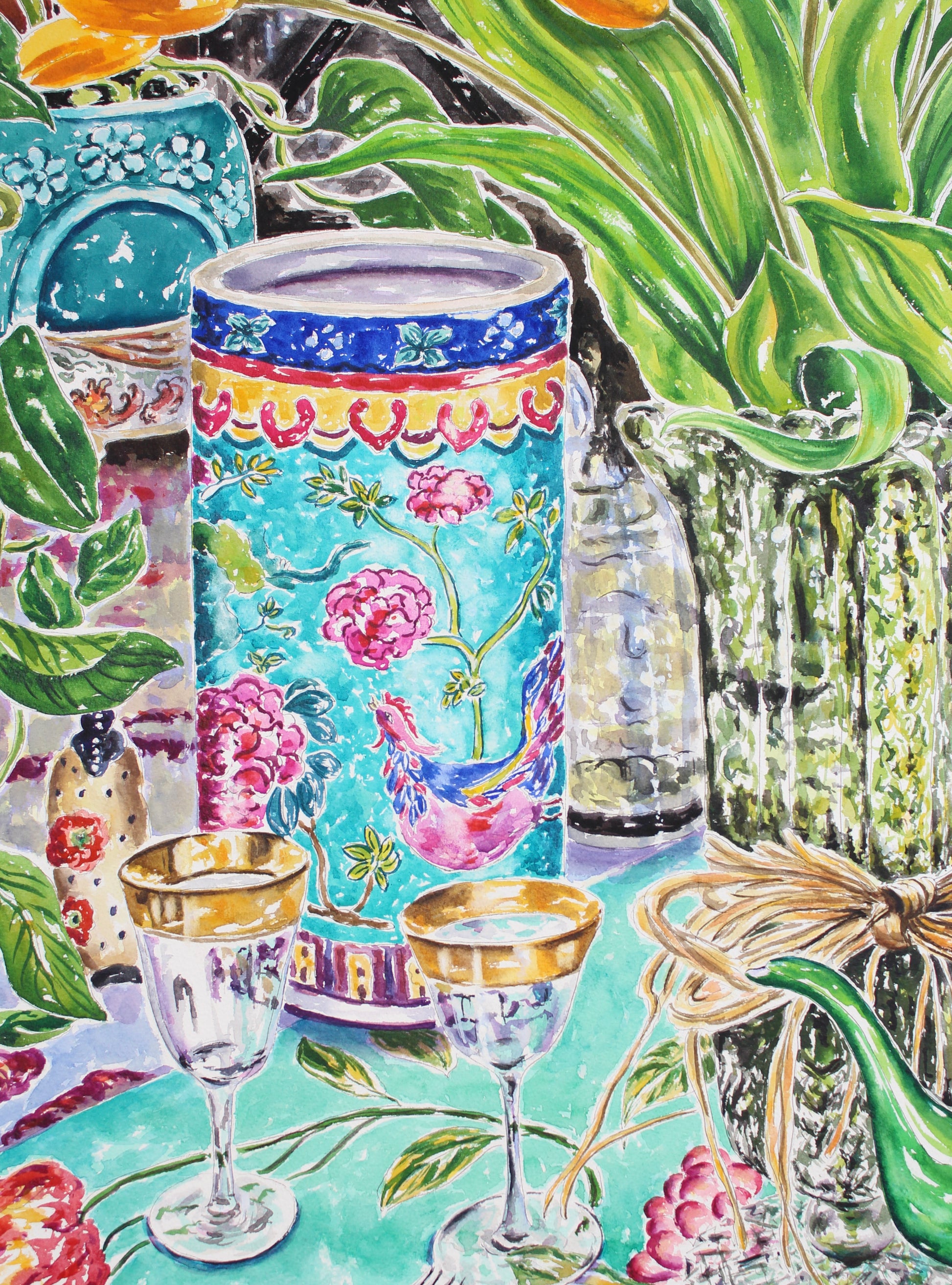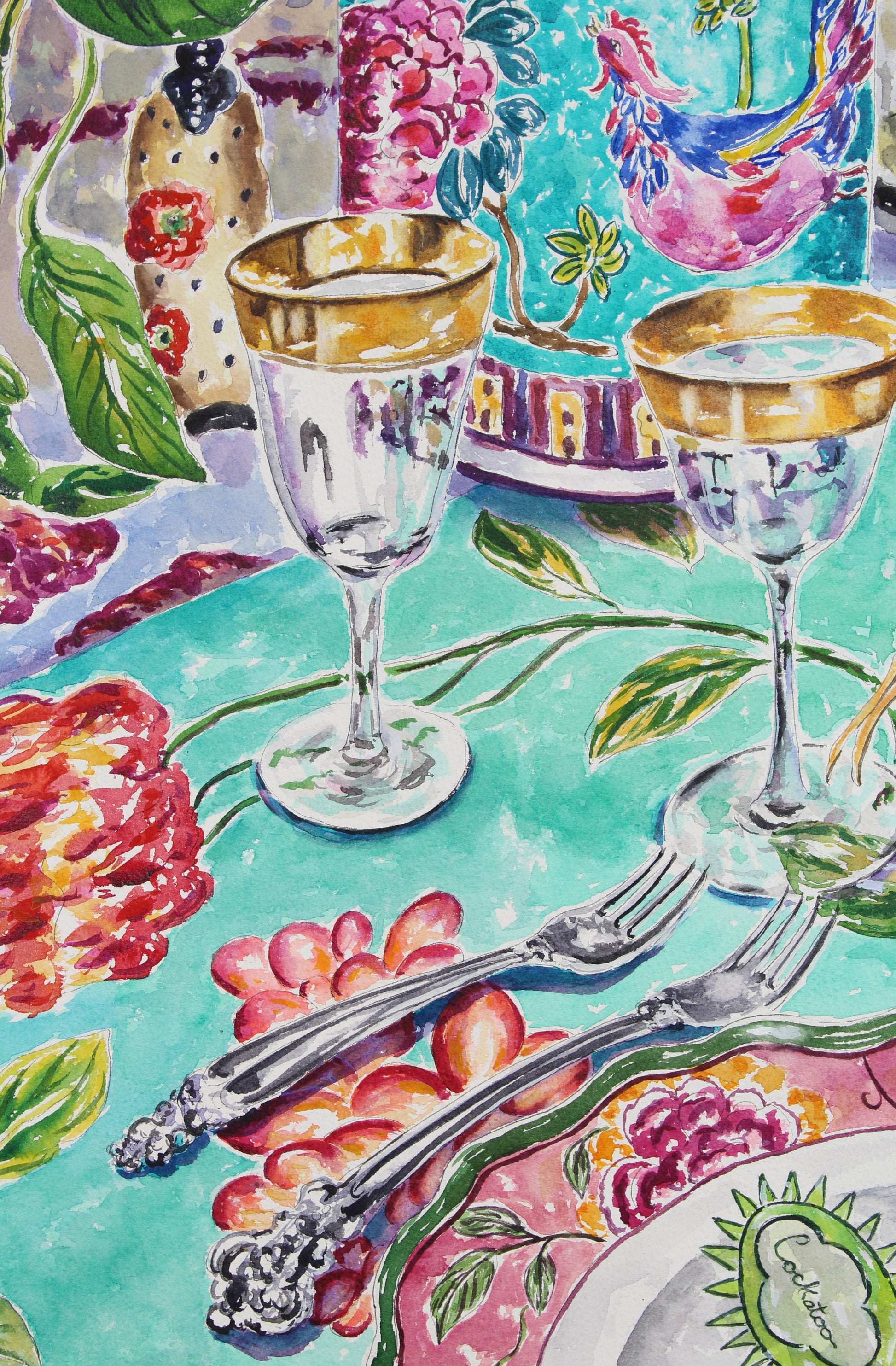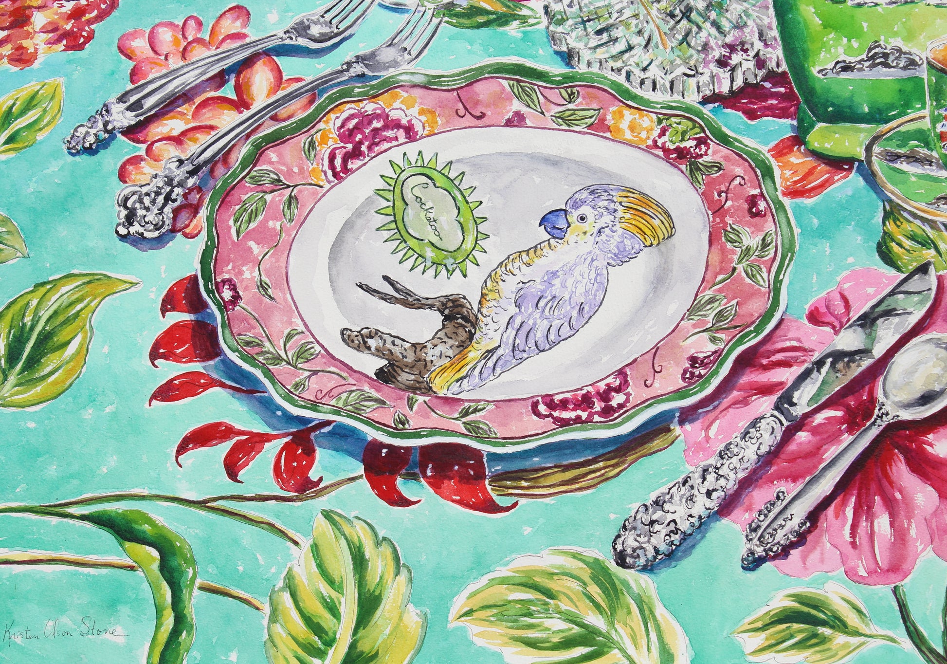 An original 50" x 40" or 127cm x 101.6cm, colorful, lively and very interesting watercolor and ink painting of 2 cockatoos in an eclectic table setting inspired by Mary F Saunders design. A vase of yellow tulips and a lemon is cleverly perched on top of the elephant sculpture. This painting is highly detailed yet still impressionist in style.